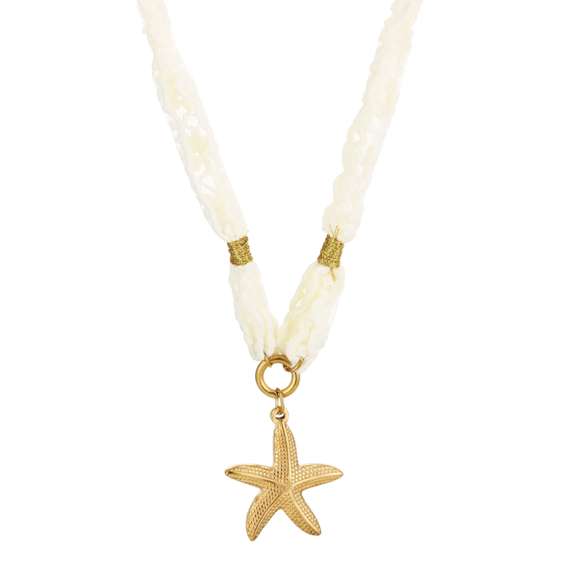 De Beach Star Ketting straalt een zomerse energie uit. De witte linten en stervormige hanger geven je outfit een frisse, lichte look – ideaal voor zonnige dagen.