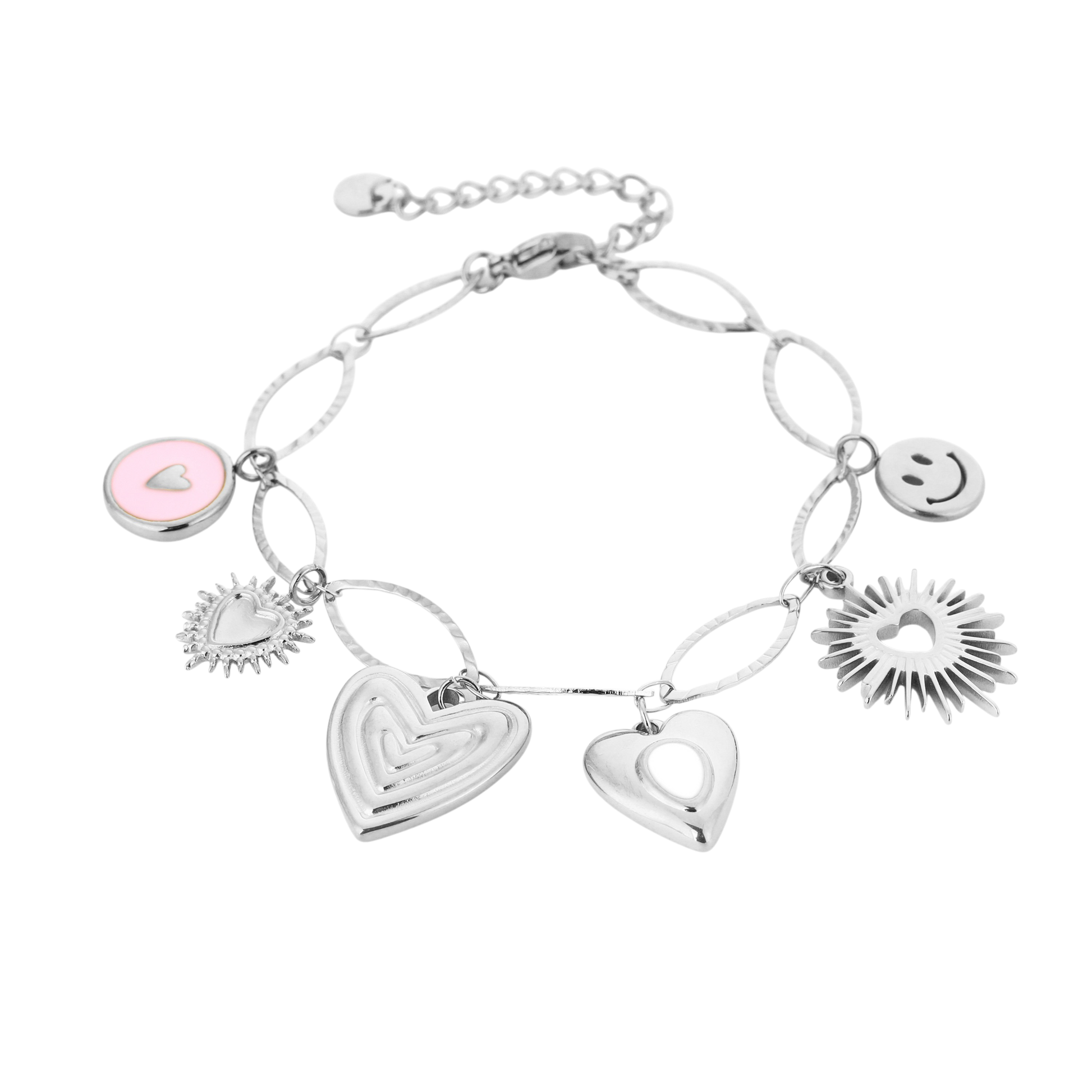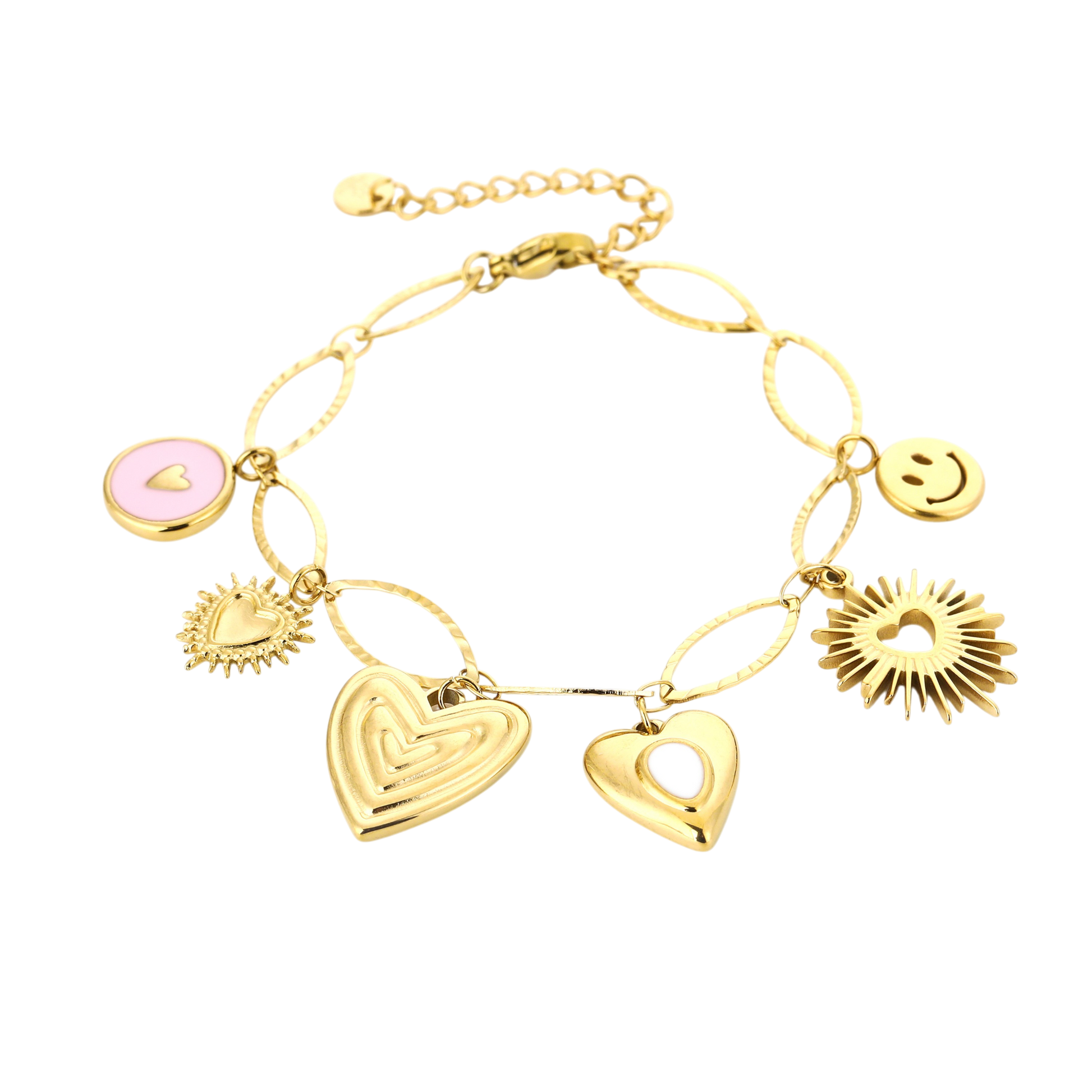 De Charm Love Armband is een speelse en elegante toevoeging aan je sieradencollectie. De armband is versierd met verschillende bedels, waaronder harten, een zon en een smiley, wat zorgt voor een vrolijke en unieke uitstraling. Gemaakt van hoogwaardig roestvrijstaal, waterproof en verkleurt niet – zodat je er elke dag van kunt genieten.