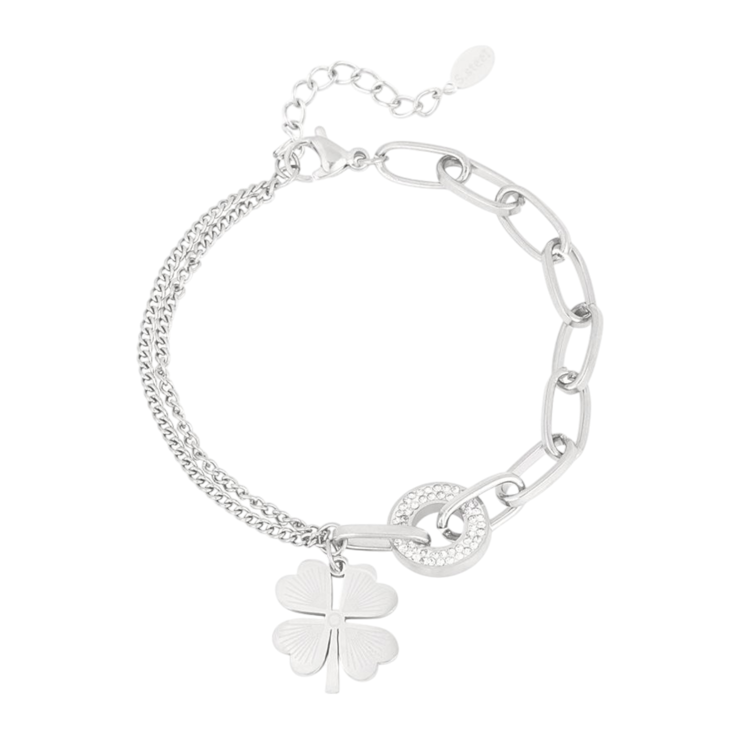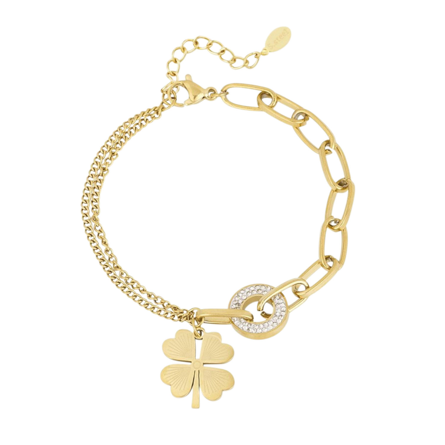 Laat je elke dag omringen door een beetje geluk met onze Chunky Lucky armband. Deze opvallende armband combineert twee stijlen – een fijne schakel en een grove ketting – met als eyecatcher een goudkleurige klavertjevier bedel en een subtiele ring ingelegd met zirkonia steentjes. Gemaakt van stainless steel met een gouden plating, zodat je lang kunt genieten van deze betekenisvolle accessoire. Perfect als cadeau of als dagelijkse reminder van positiviteit.
