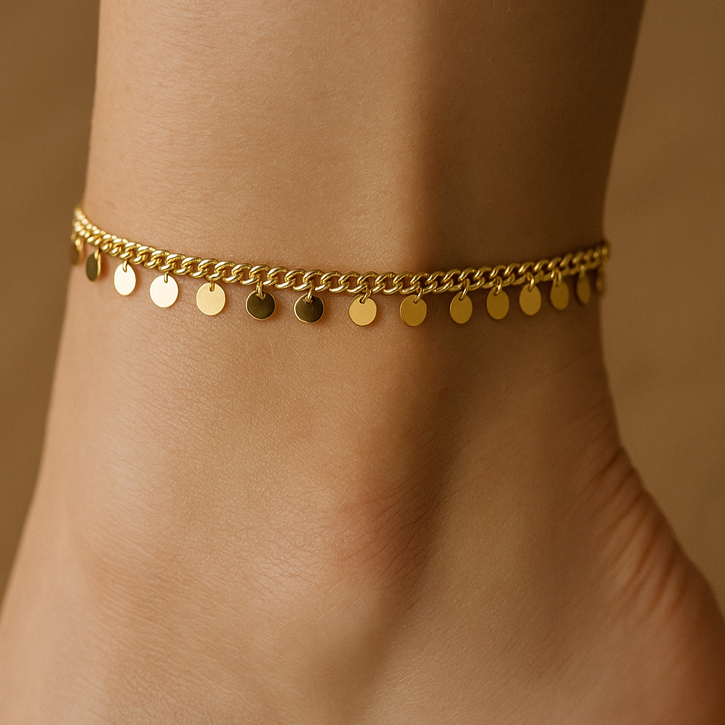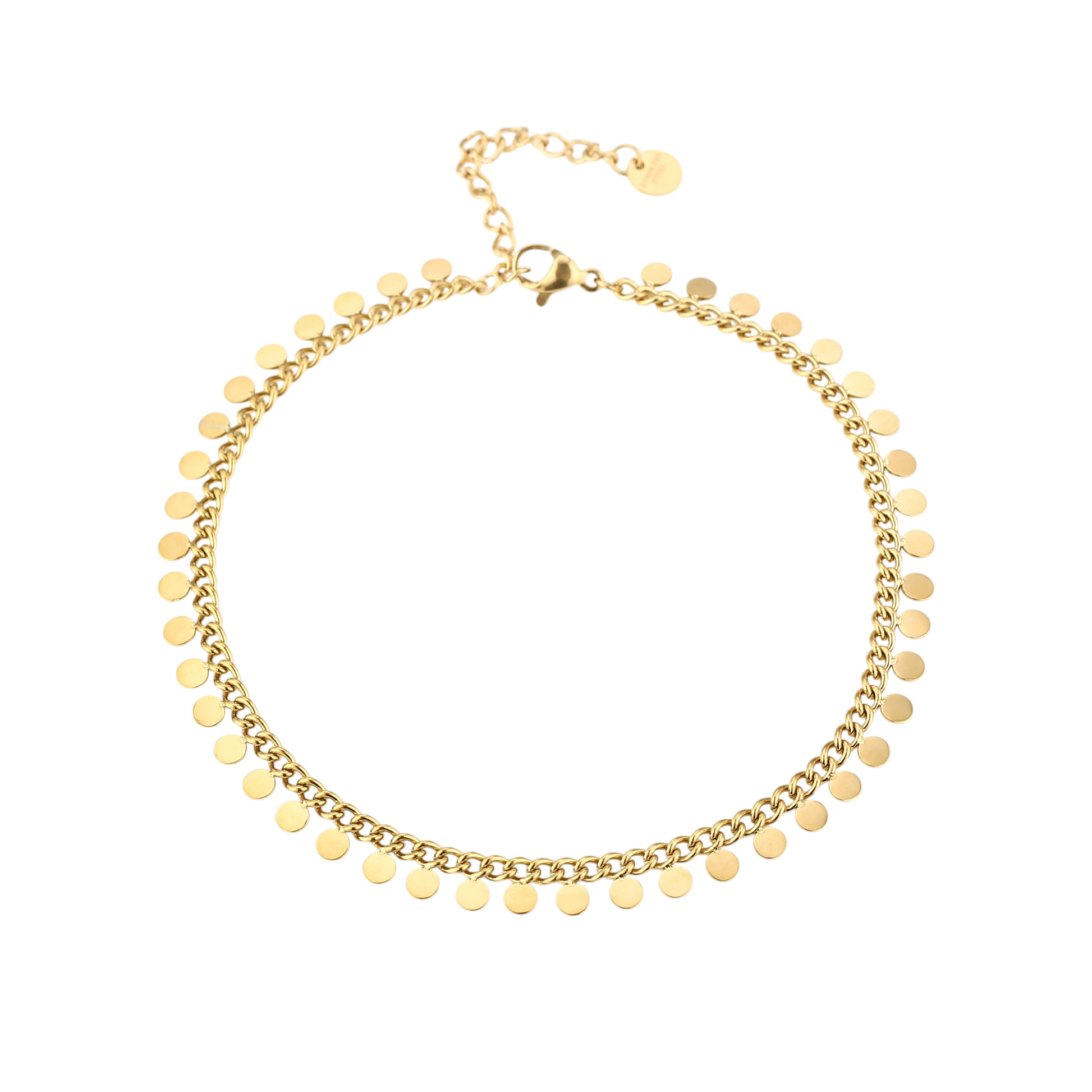 Het Dainty Discs Enkelbandje is dé finishing touch voor jouw zomerse look. De fijne schakelketting met minimalistische ronde disc bedeltjes beweegt subtiel mee bij elke stap. Perfect te combineren met sandalen, blote voeten of sneakers – dit enkelbandje straalt effortless summer vibes uit. Draag hem solo of combineer met andere enkelbandjes voor een speelse, gelaagde look.