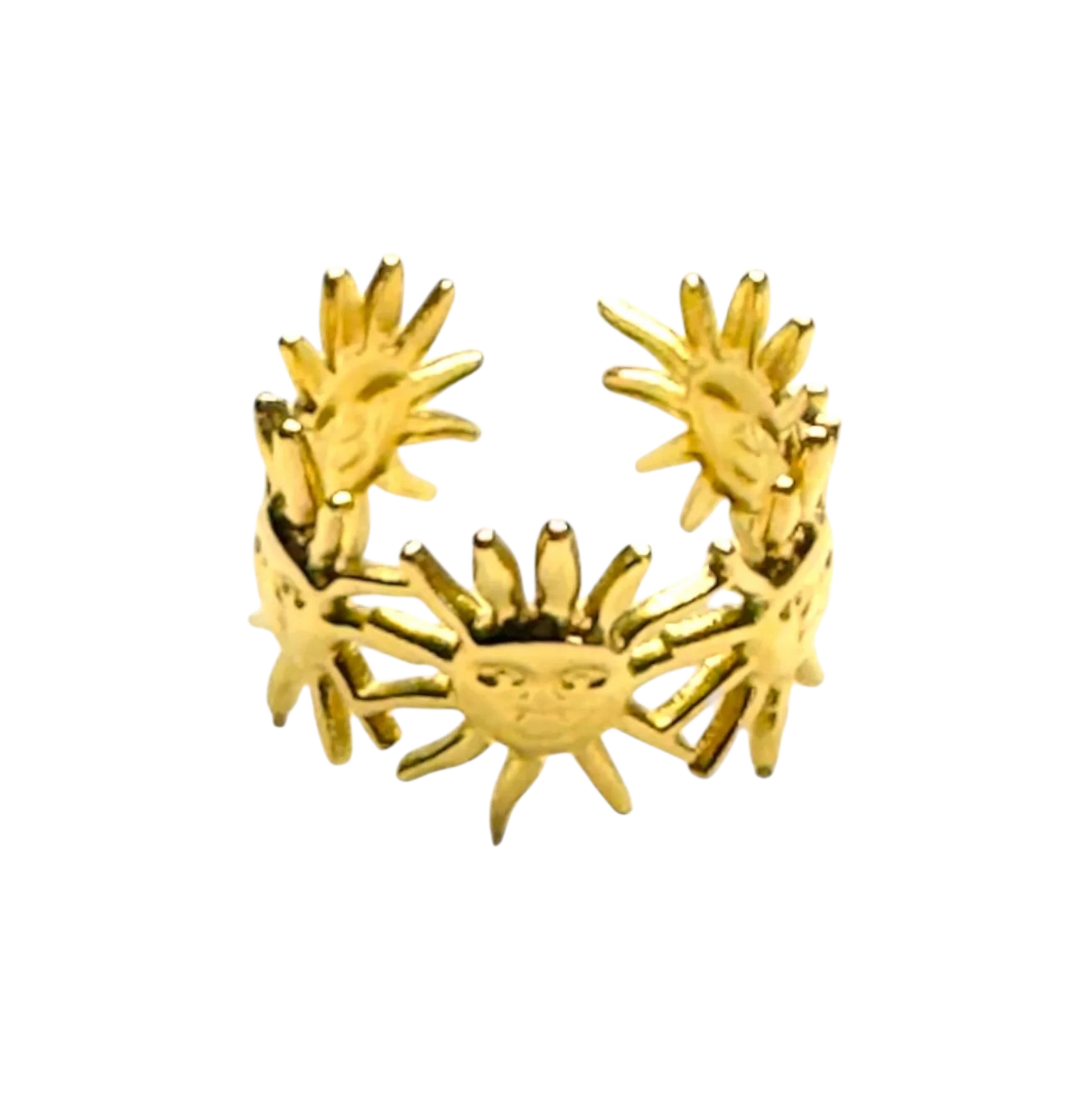 Laat je stralen met de Sunshine Spirit Ring – een opvallend ontwerp met zonnesymbolen rondom de hele band. Deze ring is perfect voor wie houdt van speelse en unieke sieraden die toch stijlvol blijven. Gemaakt van hoogwaardig roestvrijstaal, waterproof en verkleurt niet. De open achterkant zorgt voor een verstelbare pasvorm, zodat hij altijd comfortabel zit.