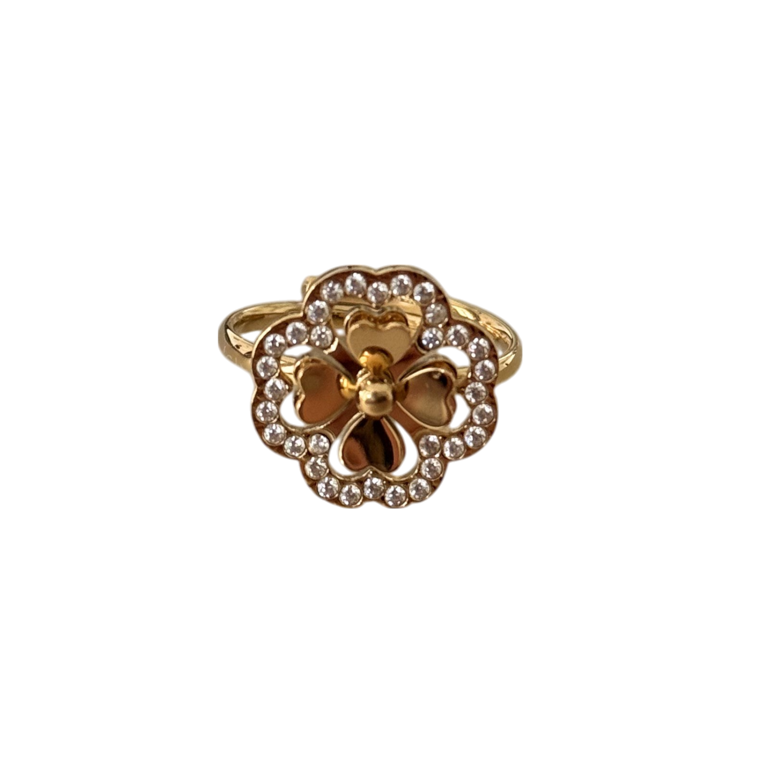 Een vleugje geluk aan je hand! De Lucky Bloom ring is een echte eyecatcher met een klavervormige binnenzijde, omringd door sprankelende steentjes. De speelse hartvormige blaadjes geven de ring een romantische en elegante uitstraling. Gemaakt van roestvrijstaal en dus bestand tegen verkleuring – ideaal voor dagelijks gebruik met een vleugje glamour.