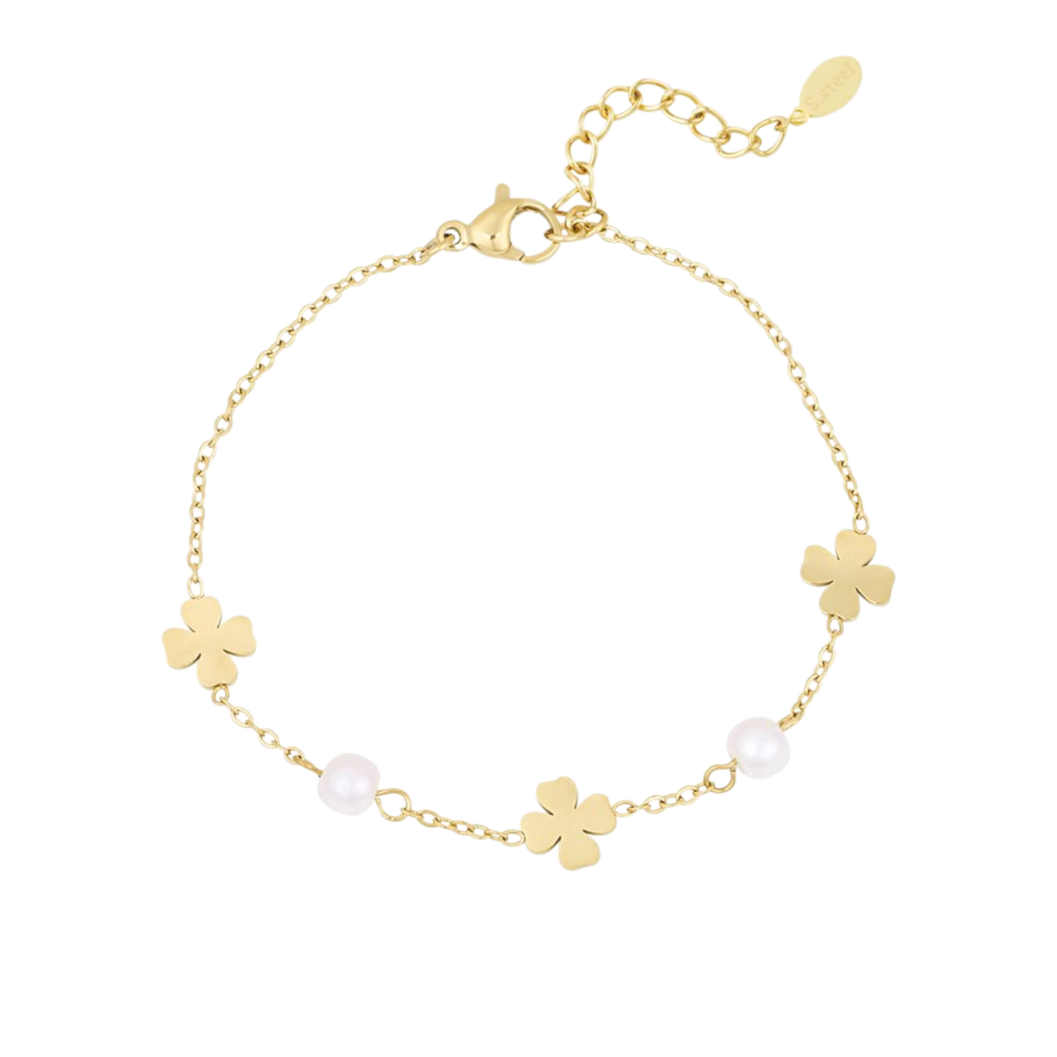 De Lucky Clover Pearl Armband staat symbool voor geluk, liefde en schoonheid. Deze verfijnde armband combineert drie subtiele klavertjes met elegante pareldetails voor een tijdloze en vrouwelijke look.