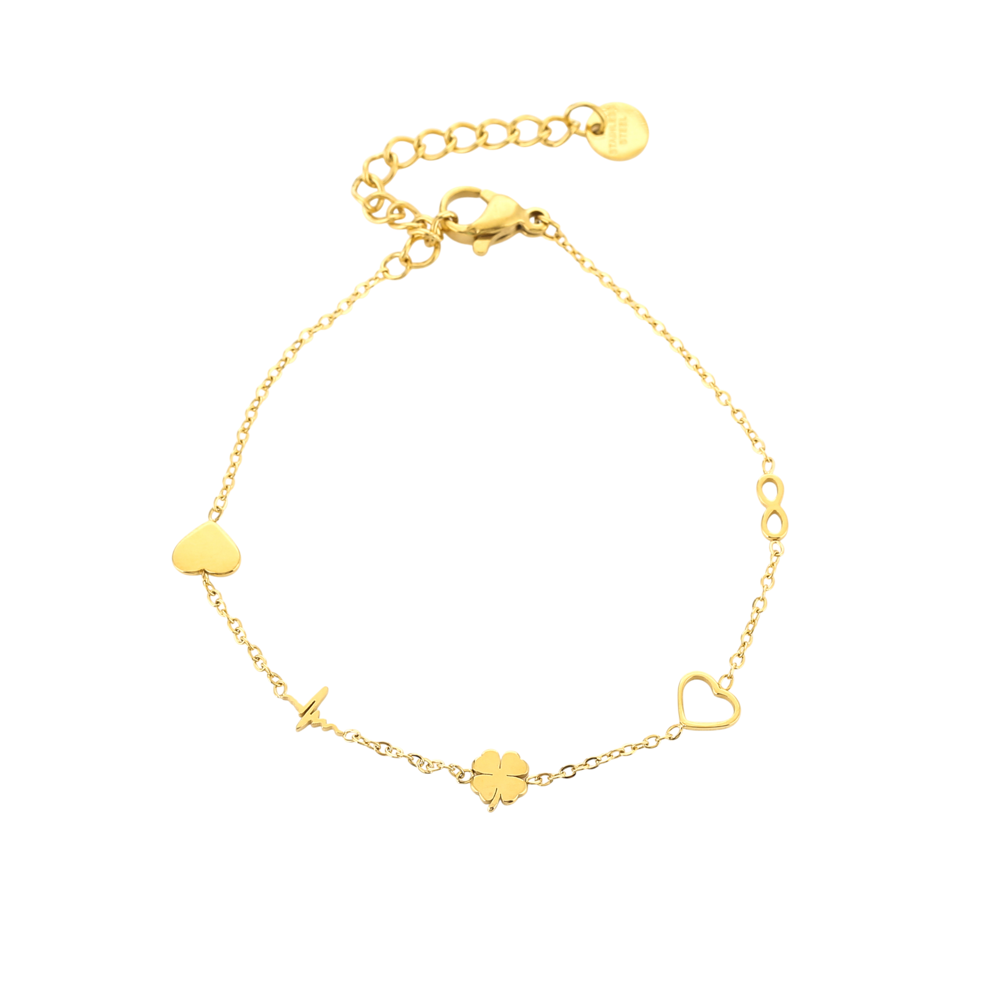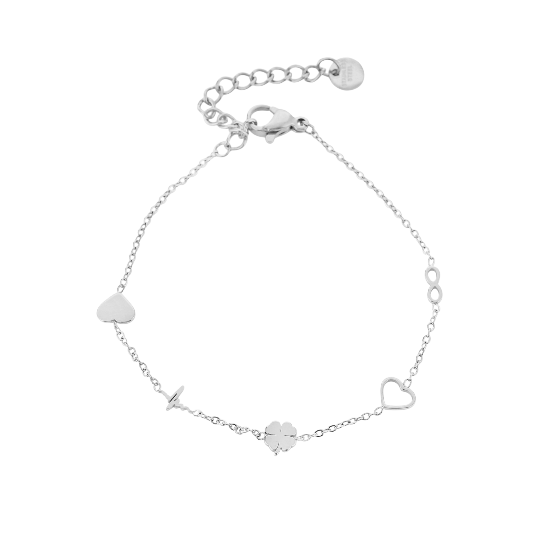 De Lucky Symbols armband brengt betekenis en stijl prachtig samen. Met een combinatie van hartjes, infinity-tekens, een klavertje en een subtiele ‘heartbeat’ charm is dit armbandje een symbolische en elegante toevoeging aan jouw sieradencollectie.