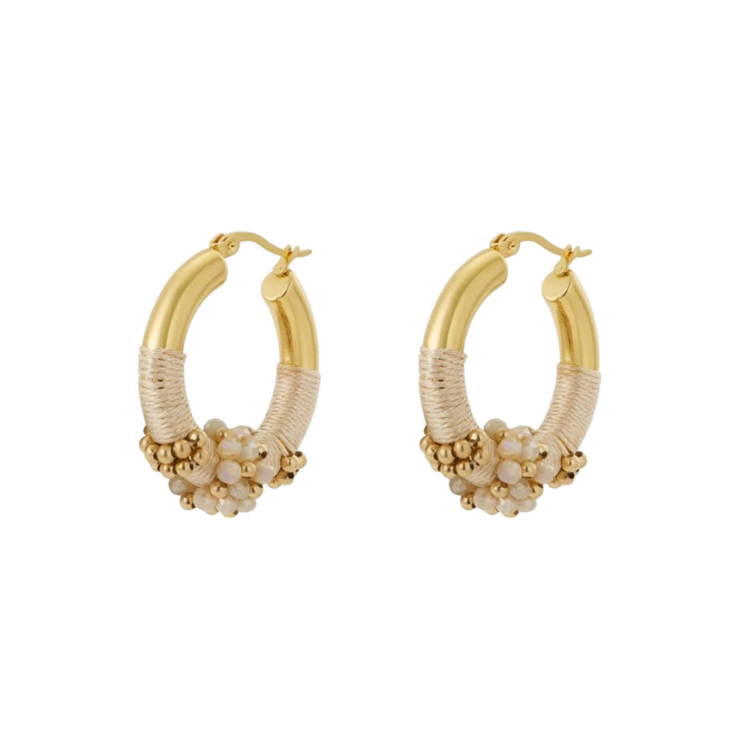 Deze stijlvolle oorringen combineren glanzende kralen met een cluster van parelachtige accenten. Perfect voor een speelse en toch elegante look.