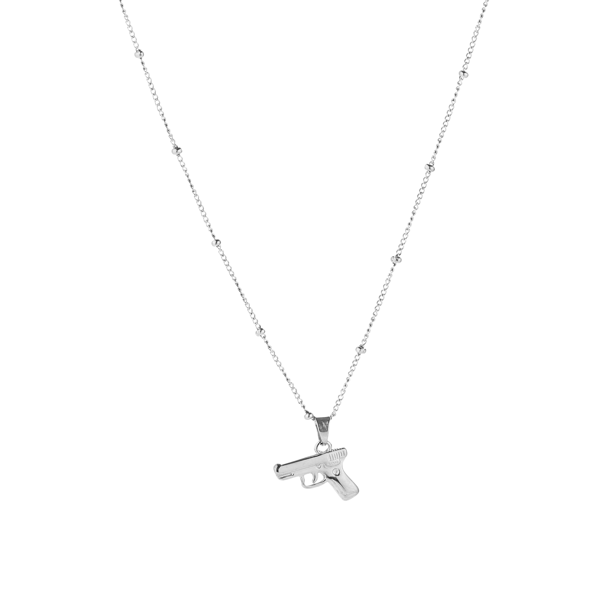 De Rebel Pendant Ketting is een opvallende ketting met een uniek pistool-bedeltje. Draag deze ketting als een statement piece of combineer hem met andere kettingen voor een gelaagde look. Perfect voor wie houdt van een edgy touch aan een minimalistische outfit.